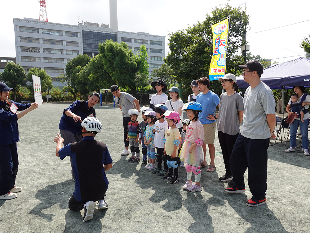 まずは保護者の方も一緒にヘルメットの正しい着用方法を学びます。