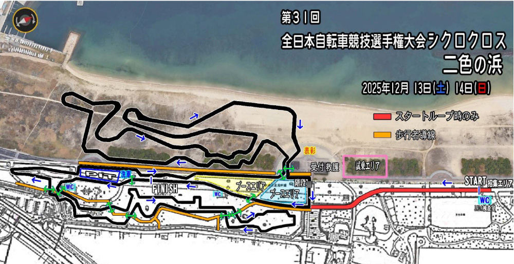 過去にもJCXのシリーズ戦として開催されてことのある二色の浜公園でのシクロクロスレースですが、コースは前半の松林を縫うように走るテクニカル区間と、後半には公園に隣接する二色の浜海水浴場の砂浜を使ったパワー区間に分かれ、両方のスキルが求められる、まさにナショナルチャンピオンを決めるにふさわしいコース設定となっています。