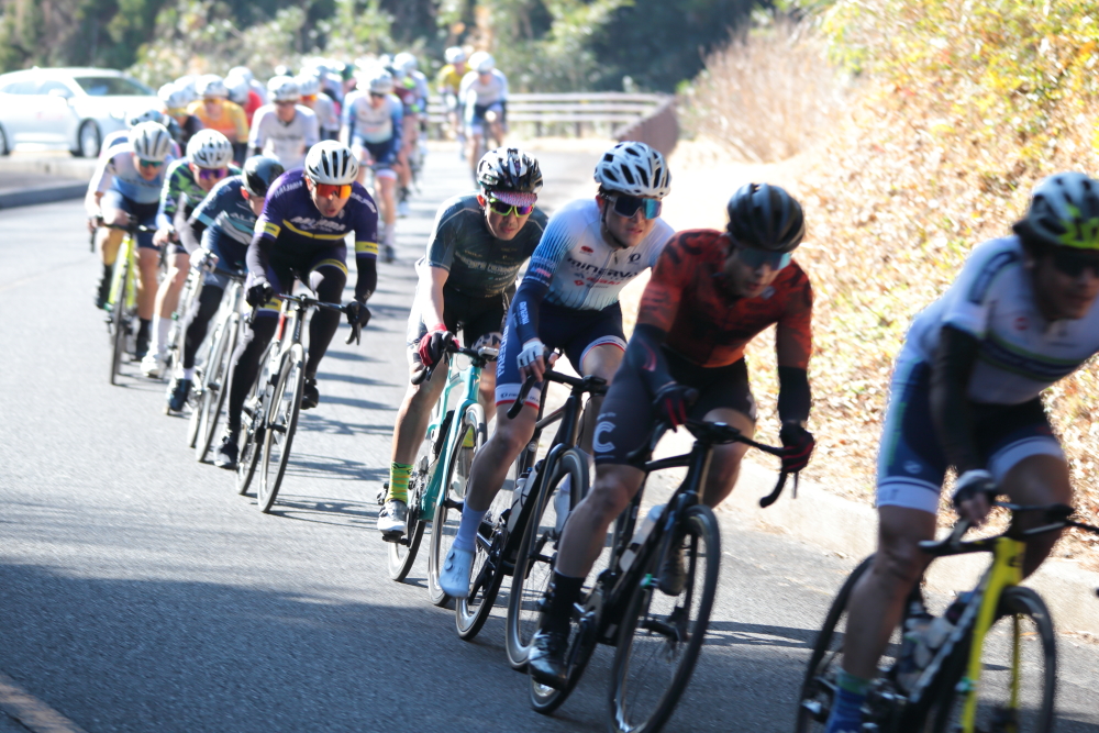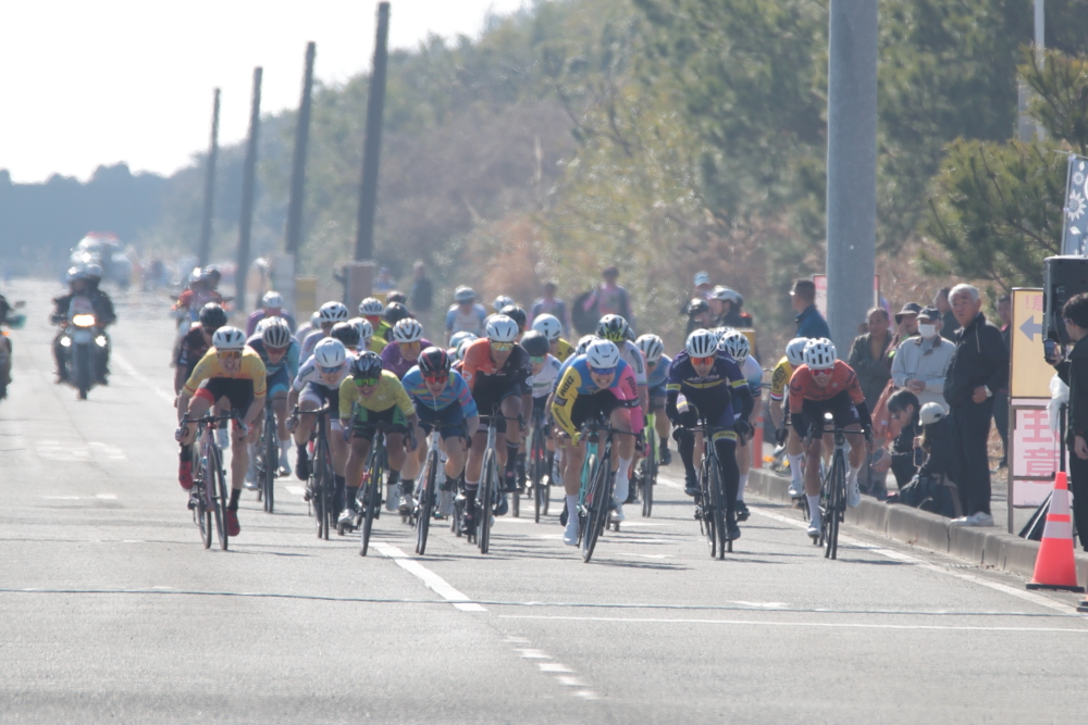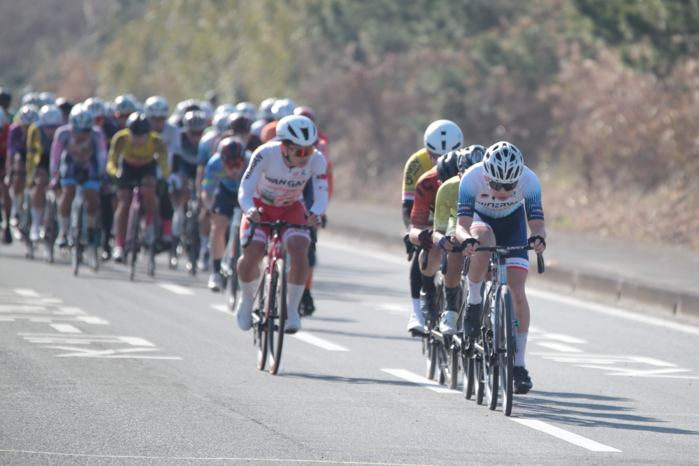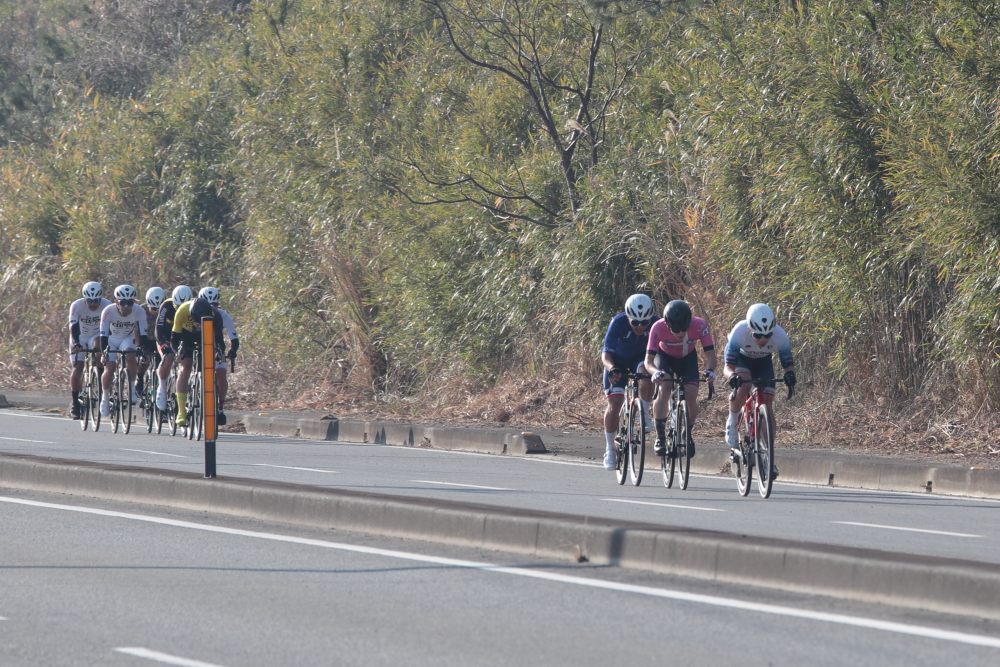 同じくチームメイトの能戸選手ら数人も追いつき、一時大きな逃げ集団になりそうでしたが、これも平坦区間で吸収されてしまいます。