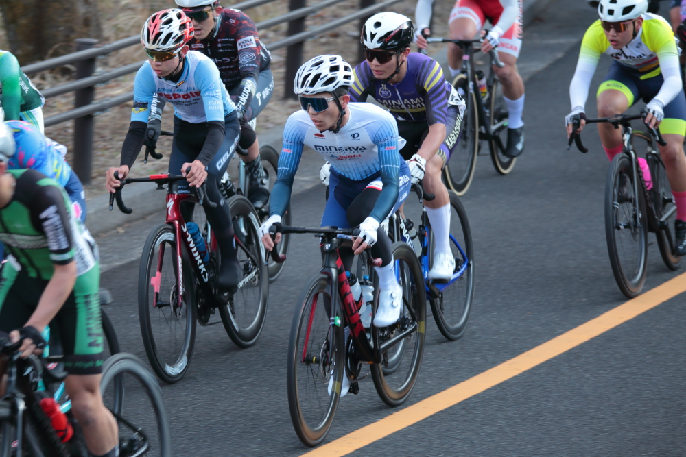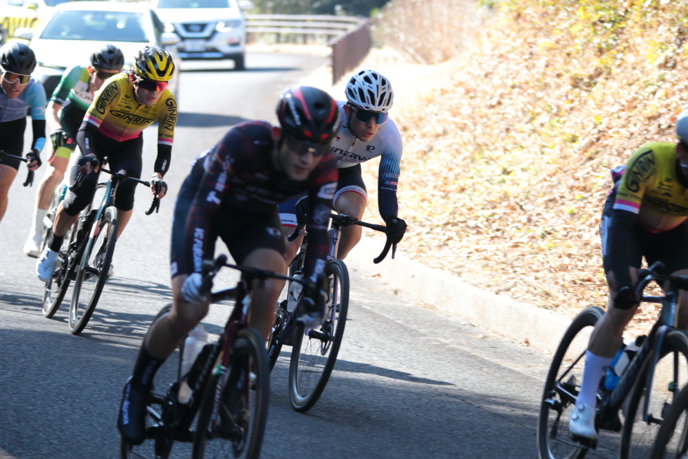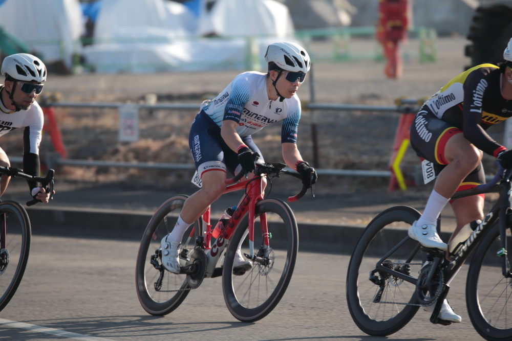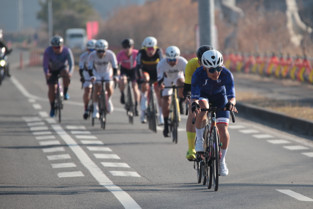 序盤から島野選手【HKD KOSHIDO】や井上選手【松山学院高等学校】、田山選手【湾岸サイクリング・ユナイテッド】を中心としたメンバーがアタックしていたので、チームメイトと被らないようにしつつ自分も逃げに乗ります。