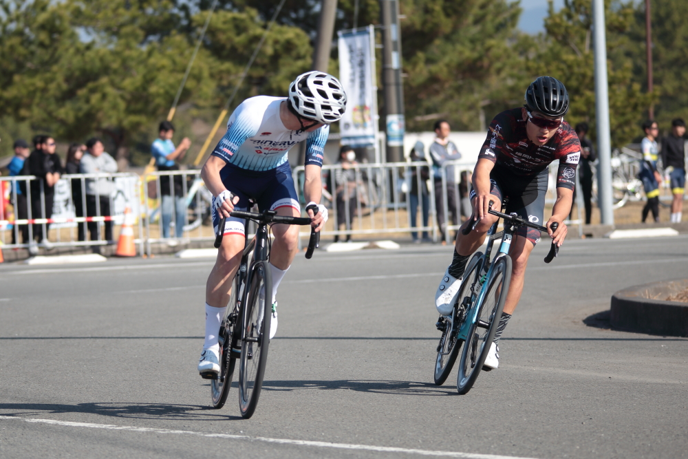 牽制し合う集団から残り500mでアタックし、チームGINRIN熊本の2名が自分を追い抜きますが、後ろからチームメイトの佐藤選手が捲って優勝となりました。