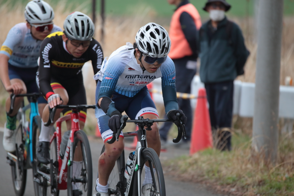 2周回目のゴール前の上りでタイミングよく自分のローテーションの番になったため逃げ狙いでアタックしたところ、石原選手【イナーメ信濃山形-EFT】、オープン参加の阿蘇選手【Astemo宇都宮ブリッツェン】、中川選手【SBC Vertex Racing Team】らが同調してくれて、10人ちょっとの逃げとなりました。
