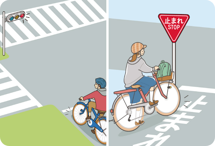 (歩道徐行等義務違反:3,000円の反則金) - 自転車も信号を守らなければなりません。車道を進行するときは「車両用信号」、横断歩道を進行するときは「歩行者用信号」に従います。また、「歩行者用信号」に「歩行者・自転車専用」の標示がある場合は、車道を通行するときであっても、「歩行者用信号」に従います。(信号無視:6,000円の反則金)