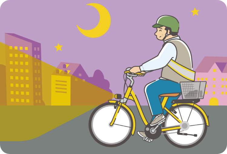 - 無灯火は、道路の状況の確認や、周りの自動車、歩行者の発見がしづらくなるだけではなく、他から自転車が見えにくくなるので非常に危険です。安全のため、夜間はライトを点灯し、反射器材を備えた自転車を運転しましょう。