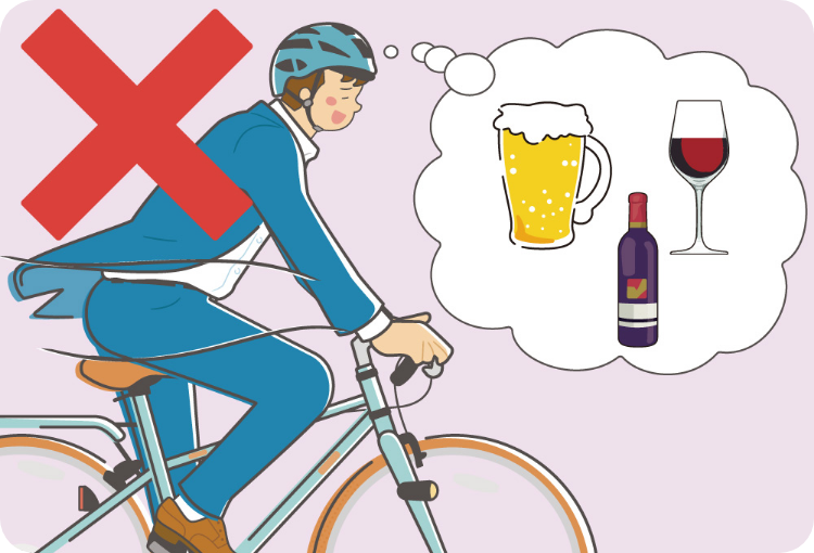 (無灯火:5,000円の反則金) - 自動車の場合と同じく飲酒をした後に自転車を運転してはいけません。また、飲酒をした人に自転車を提供したり、飲酒をした人に要求・依頼して自転車に同乗したりしてはいけません。自転車を運転する人に酒類を提供することも罰則の対象となります。(酒酔い運転:5年以下の拘禁刑又は100万円以下の罰金、酒気帯び運転:3年以下の拘禁刑又は50万円以下の罰金)