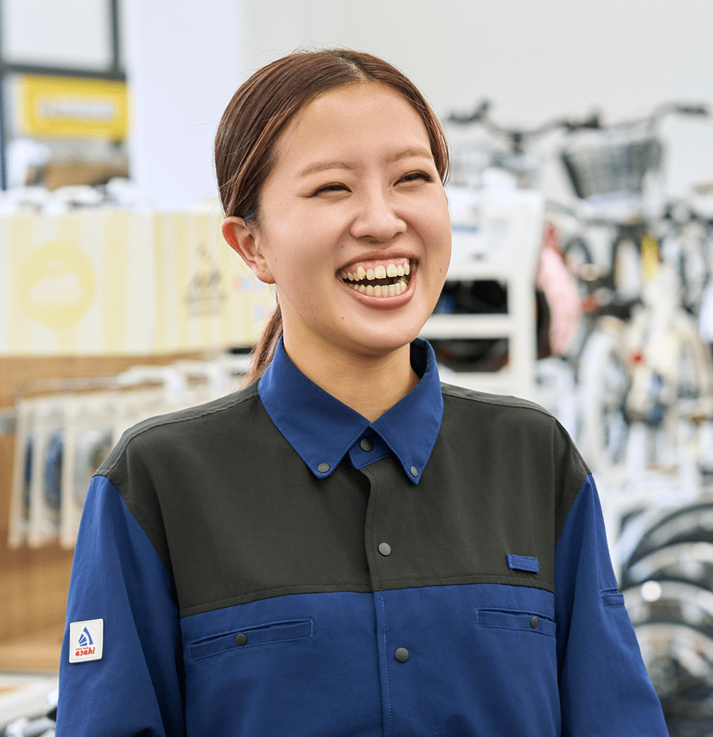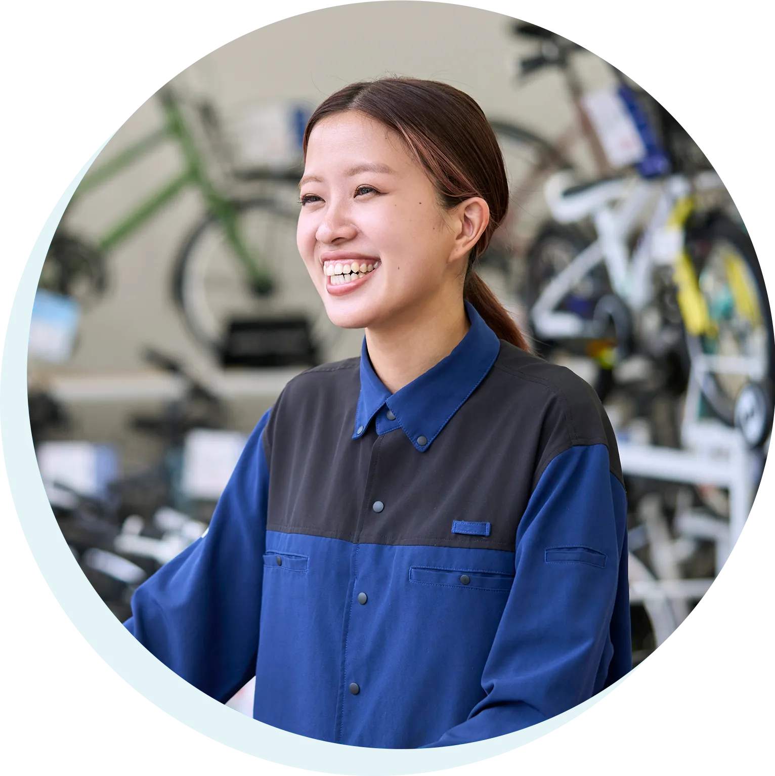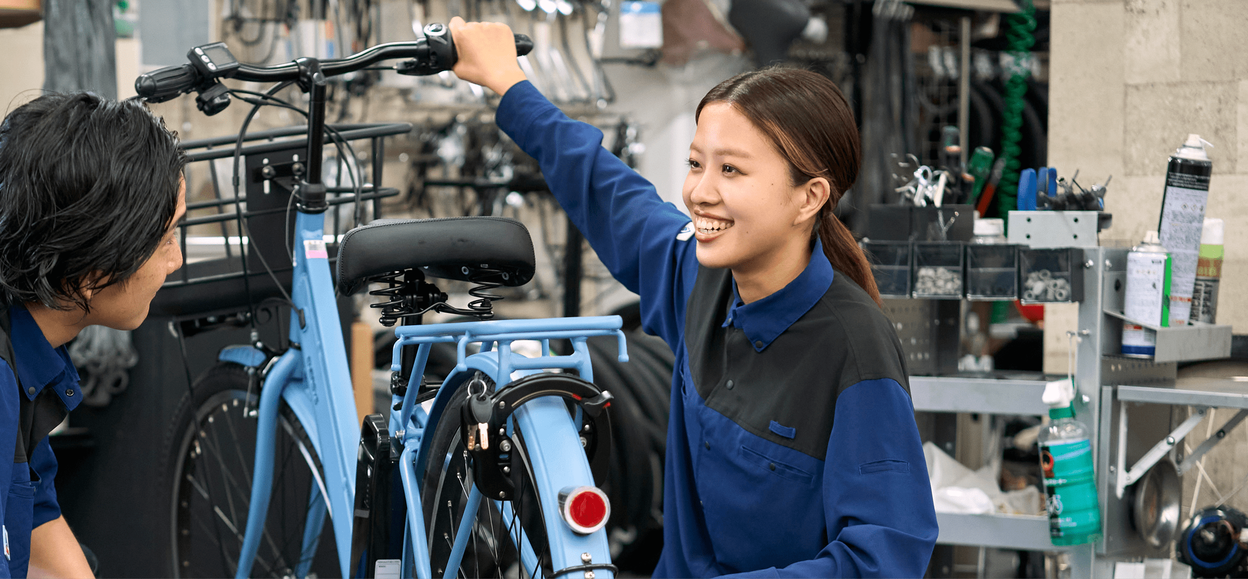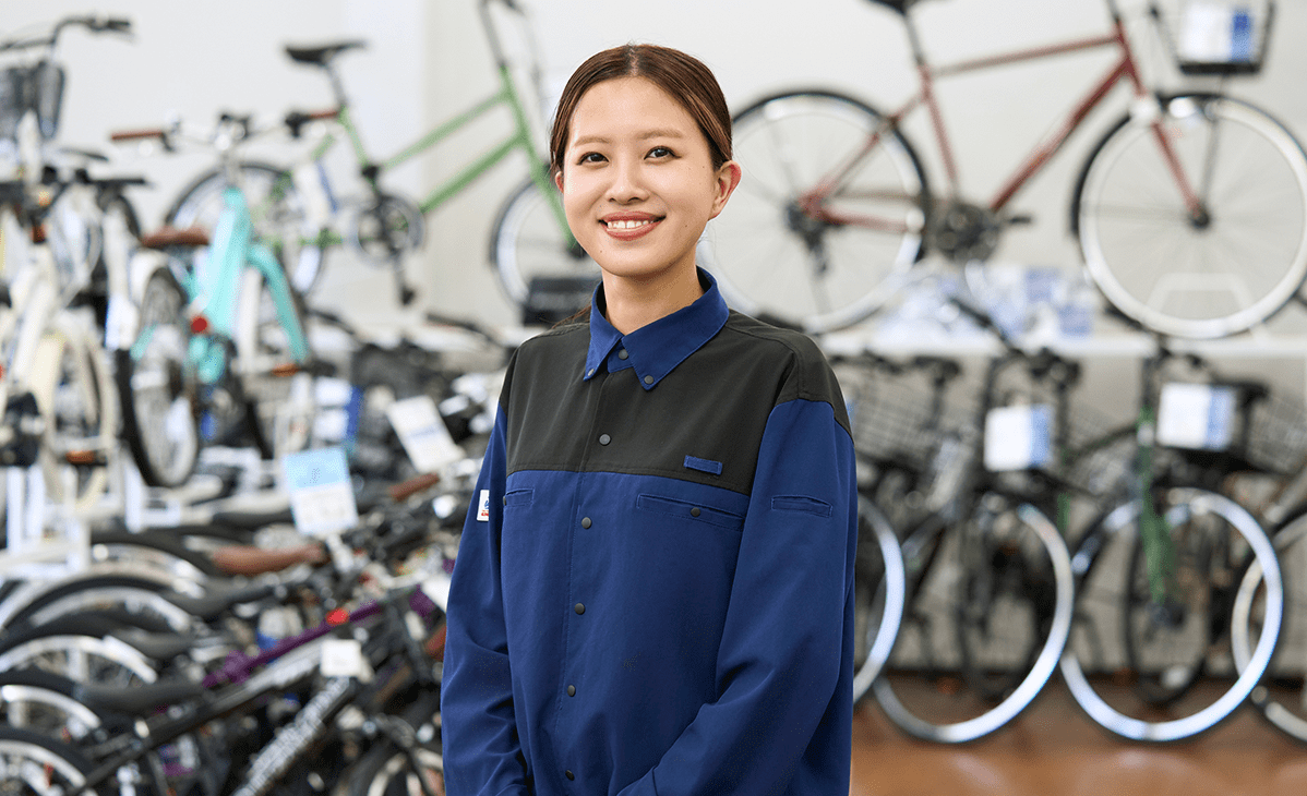 店舗で販売や修理業務を担当しています。入社時、自転車の知識はほぼゼロでしたが、日々の業務を通じて自然と身につき、今ではスポーツ車以外であれば大体対応できるようになりました。修理に使うツールは、電動のものや空気圧を利用するものもあり、女性に限らず、体力に自信がない方も安心して取組めます。