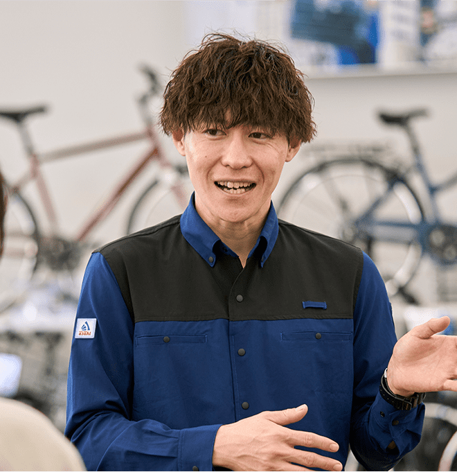 私は大学時代からロードバイクが趣味だったので、ある程度の知識はありましたが、まったく知識がない人でも、研修を重ねる中で確実に技術を身につけていく姿を目にしています。店舗の仕事は接客だけでなく修理業務をしている時間も多いですが、研修がしっかりしているので心配は要りません。