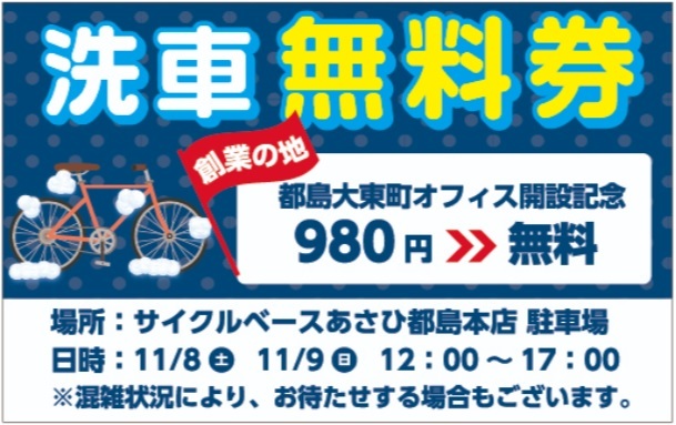 ・洗車無料券は、配布期間中に都島本店にて新車をご購入いただいたお客様にのみお配りしております。