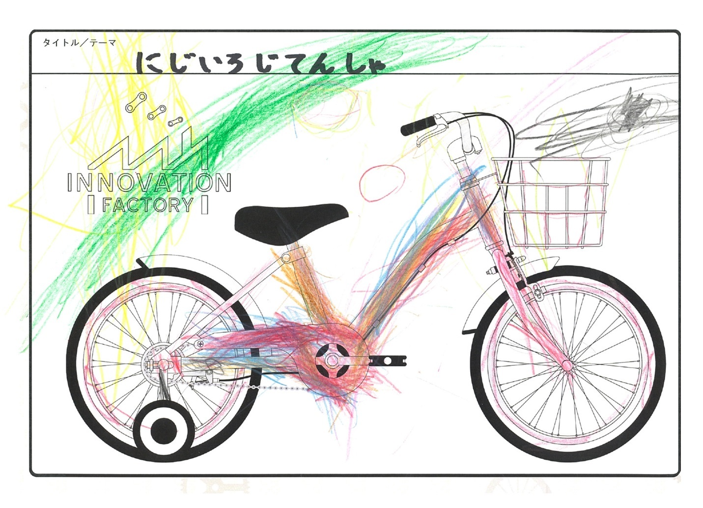 自転車クリエイターチームで話し合い、今回はこちらの「にじいろじてんしゃ」を最優秀に選出。虹色の表現が一味違い、光の反射や色の重なりを感じさせる面白さが、私たちの創作意欲を強く刺激しました。さらに、カゴのワイヤーやホイールなど細部は細かな線で描かれている点も印象的です。これからものびのび才能を育ててください。いつか一緒に、あさひで自転車をデザインしましょう!